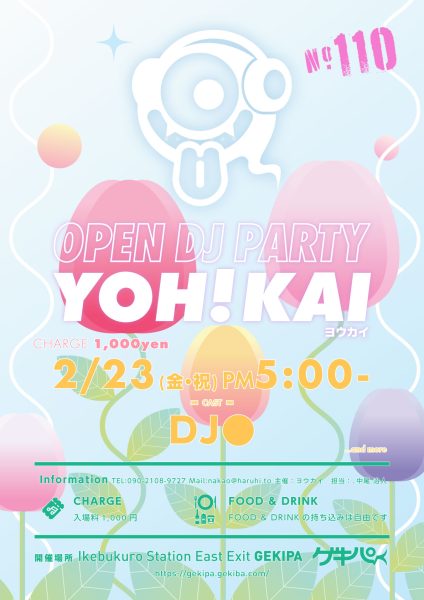 2月23日(金・祝)PM5:00時~ 池袋東口 Exciting Party Space ゲキパにてオープンDJパーティヨウカイ110を開催いたします
