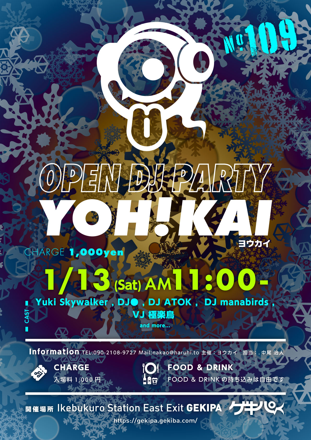 1月13日(土)AM11時~ 池袋東口 Exciting Party Space ゲキパにてオープンDJパーティヨウカイ109を開催いたします