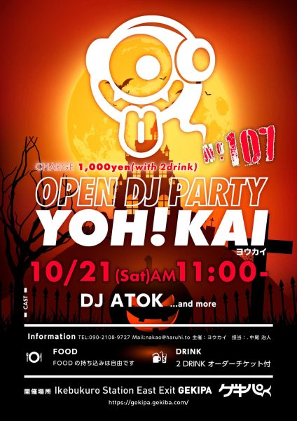 10月21日(土)AM11時~ 池袋東口 Exciting Party Space ゲキパにてオープンDJパーティヨウカイ107を開催いたします