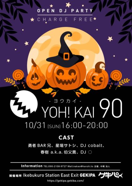 10月31日(日)16時~ 池袋東口 Exciting Party Space ゲキパにてオープンDJパーティヨウカイ90を開催いたします