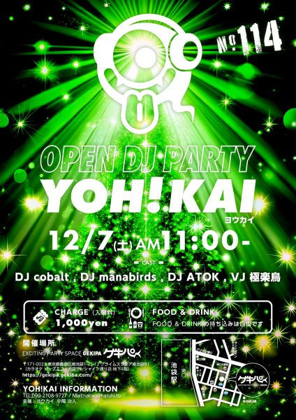 12月7日(土)AM11:00~ 池袋東口 Exciting Party Space ゲキパにてオープンDJパーティヨウカイ114を開催いたします