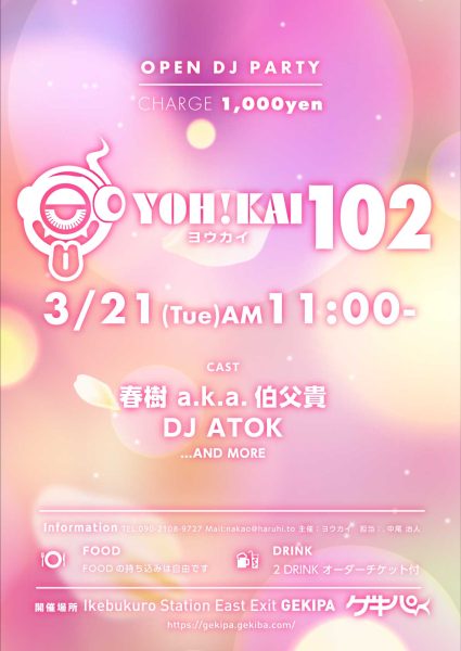 3月21日(火・祝)AM11時~ 池袋東口 Exciting Party Space ゲキパにてオープンDJパーティヨウカイ102を開催いたします