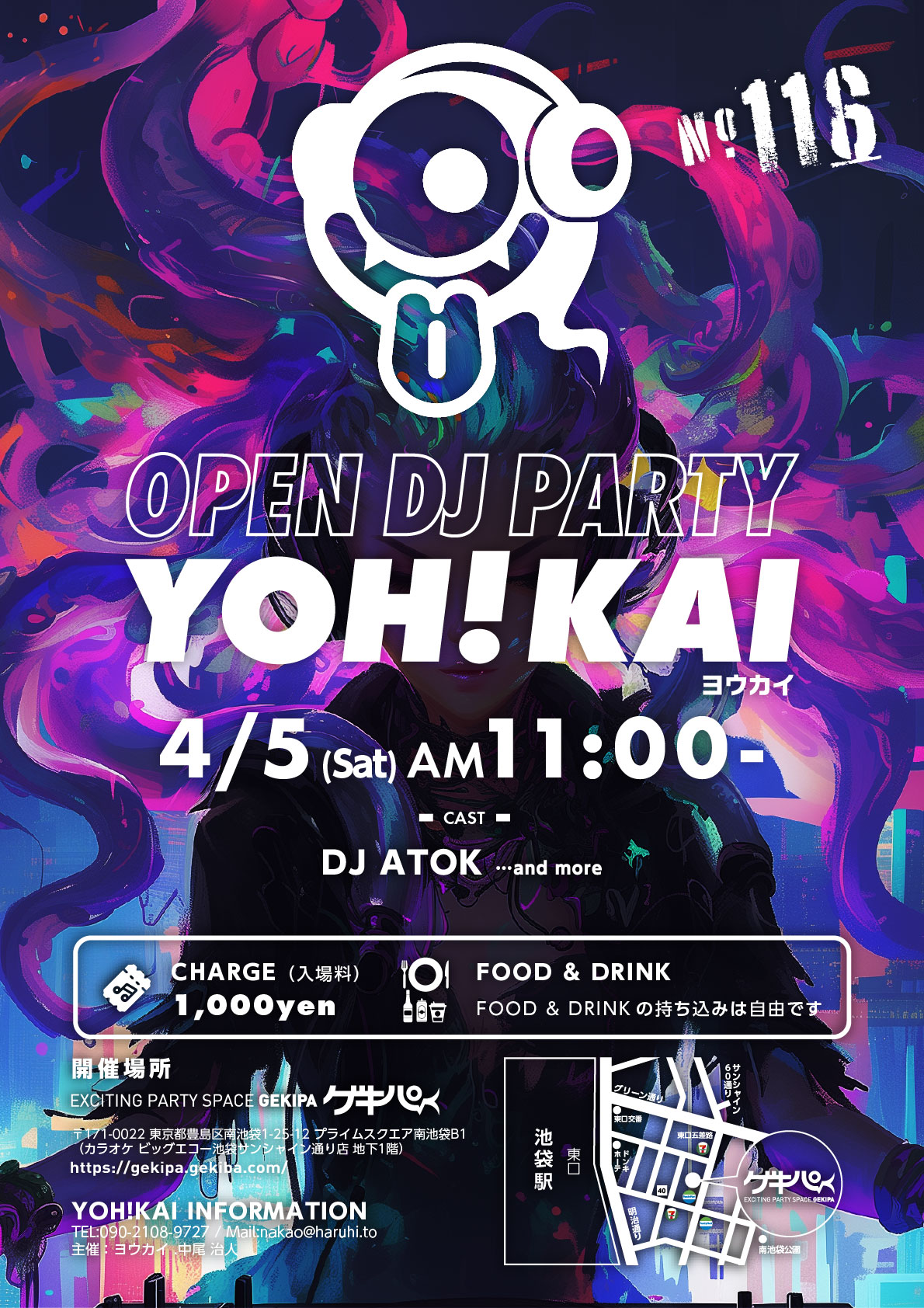4月7日(Sat)AM11:00~ 池袋東口 Exciting Party Space ゲキパにてオープンDJパーティヨウカイ116を開催いたします