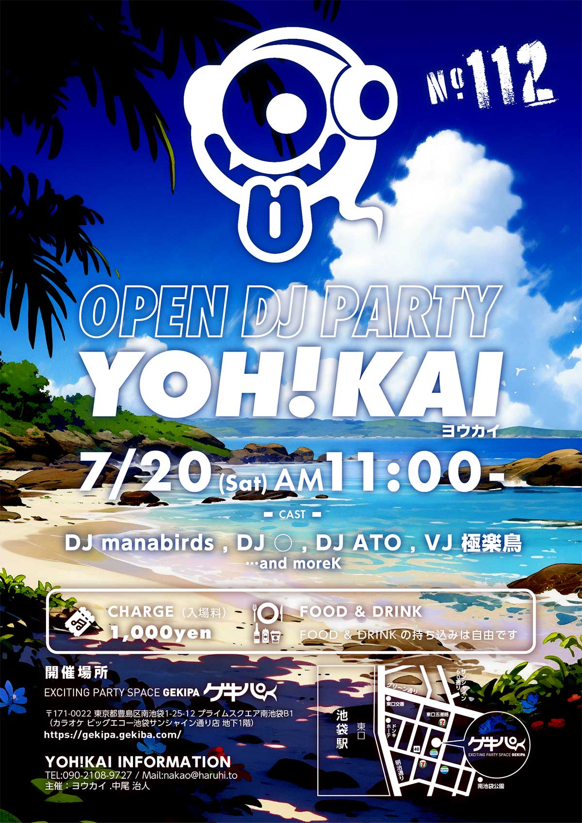 7月20日(土)AM11:00~ 池袋東口 Exciting Party Space ゲキパにてオープンDJパーティヨウカイ112を開催いたします
