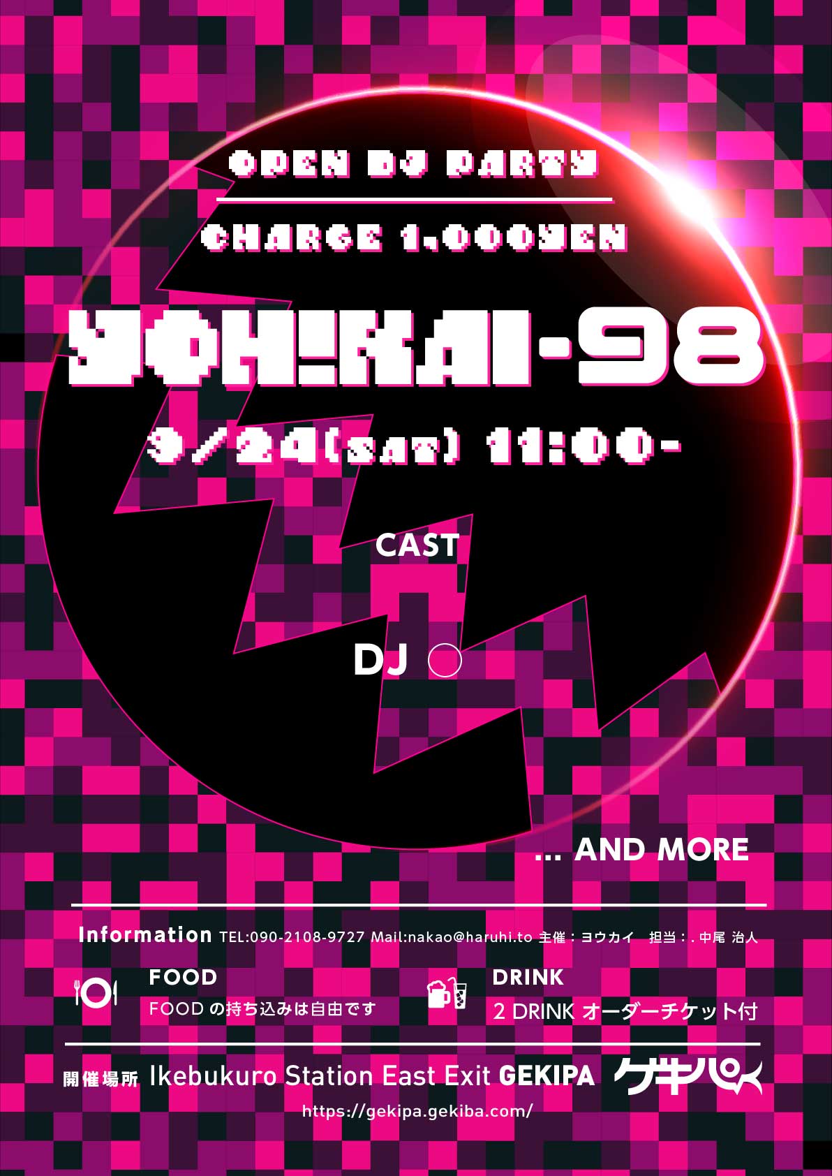 9月24日(土)11時~ 池袋東口 Exciting Party Space ゲキパにてオープンDJパーティヨウカイ98を開催いたします