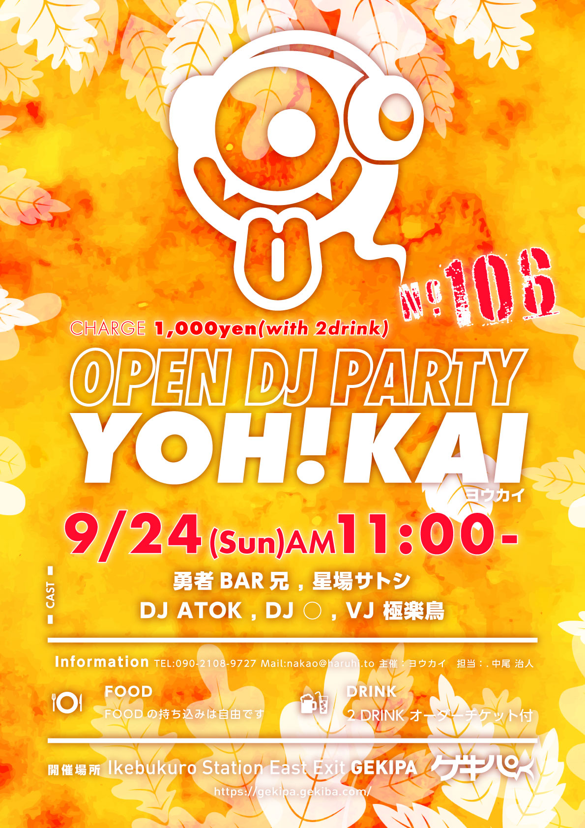 9月24日(日)AM11時~ 池袋東口 Exciting Party Space ゲキパにてオープンDJパーティヨウカイ106を開催いたします