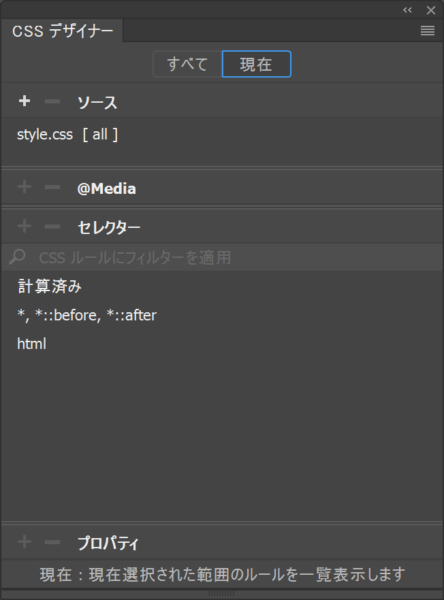 Dreamweaver 2020 インジケーターから任意のCSSへジャンプしない場合、CSSデザイナーパネルの表示を「現在」にすると解決しました